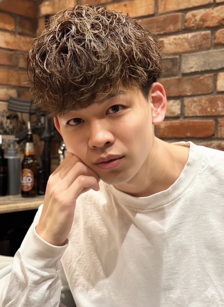 今回のスタイルは、男らしさと色気を両立できる人気のスペインカール。全体に強すぎないカールをかけ、ラフで立体感のあるシルエットに仕上げています。直毛では出しにくい動きや陰影が出るため、髪型ひとつで印象を大きく変えたい方におすすめです。
